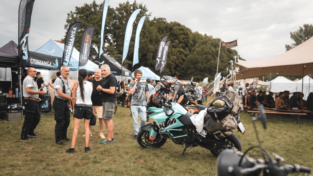 At events, Mosko Moto creates a booth experience that goes far beyond product promotion. While their full product range is showcased, the real magic lies in the conversations their team has with visitors. These discussions often revolve around motorcycle travel, motocamping, and adventure riding in general—topics that resonate deeply with their audience. The atmosphere is made even more authentic with customer bikes prominently displayed, often still dusty from recent trips, reflecting the true spirit of adventure.